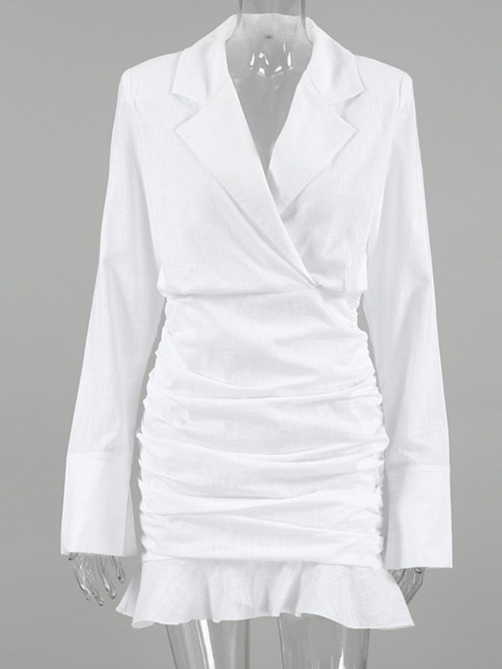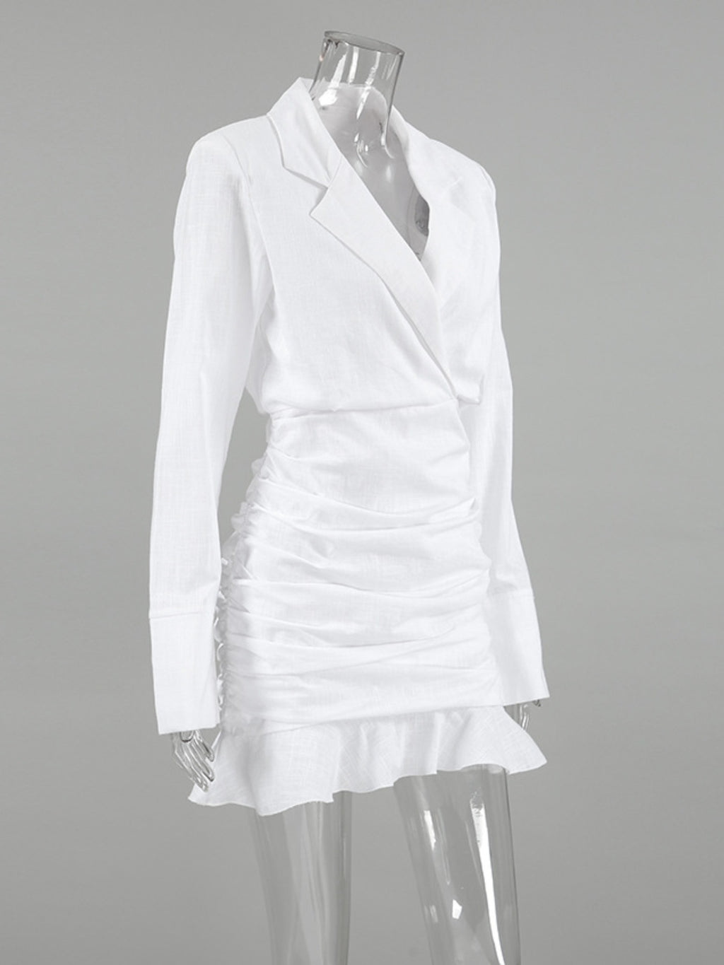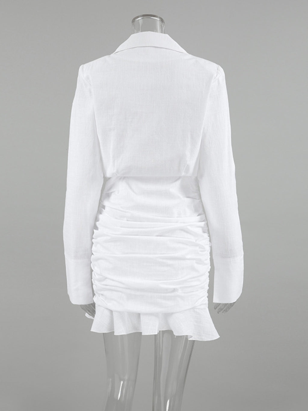 The Camille Dress borrows its attitude from classic suiting and reworks it into a curve-skimming mini. Designed with a blazer-inspired silhouette, it features a structured collar, clean lapel lines, and subtle ruching that shapes the waist without feeling tight.