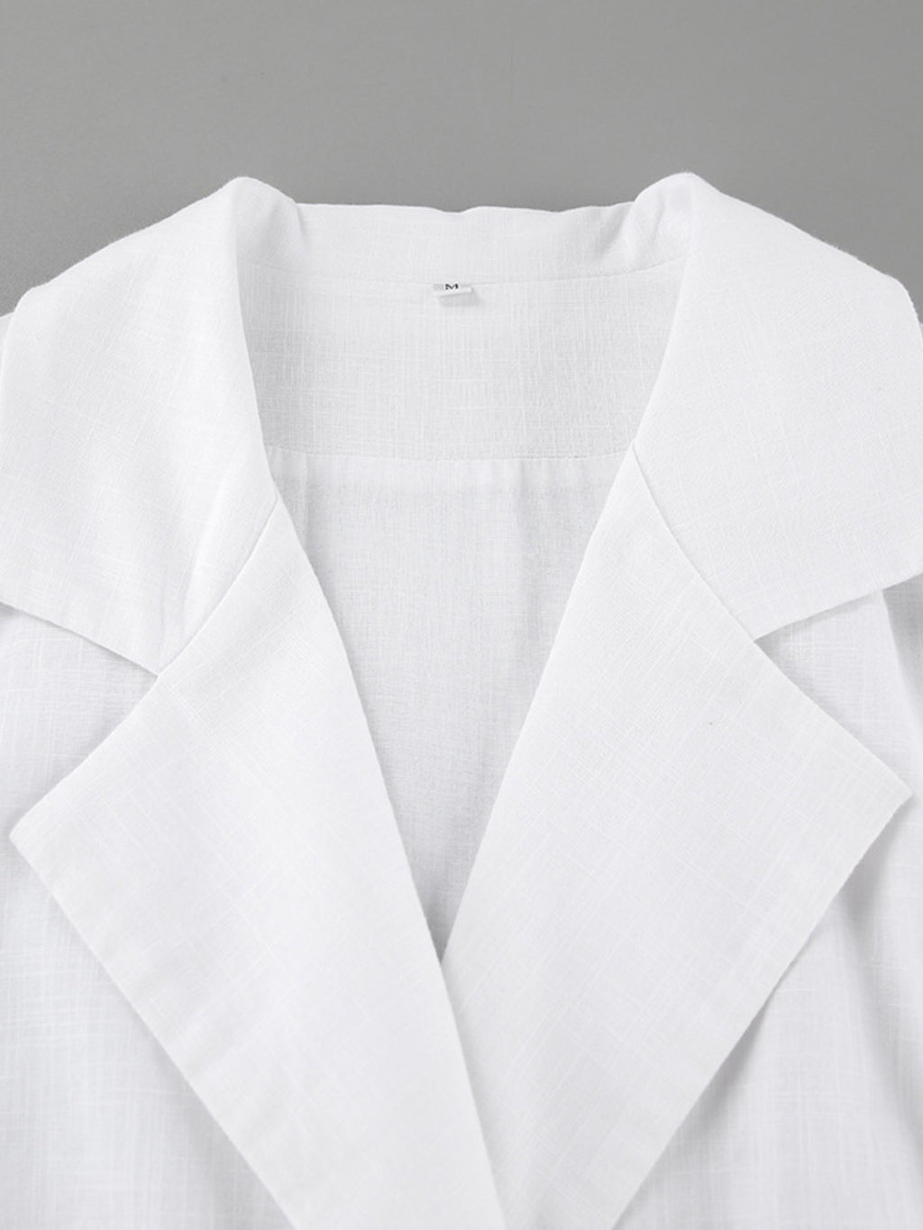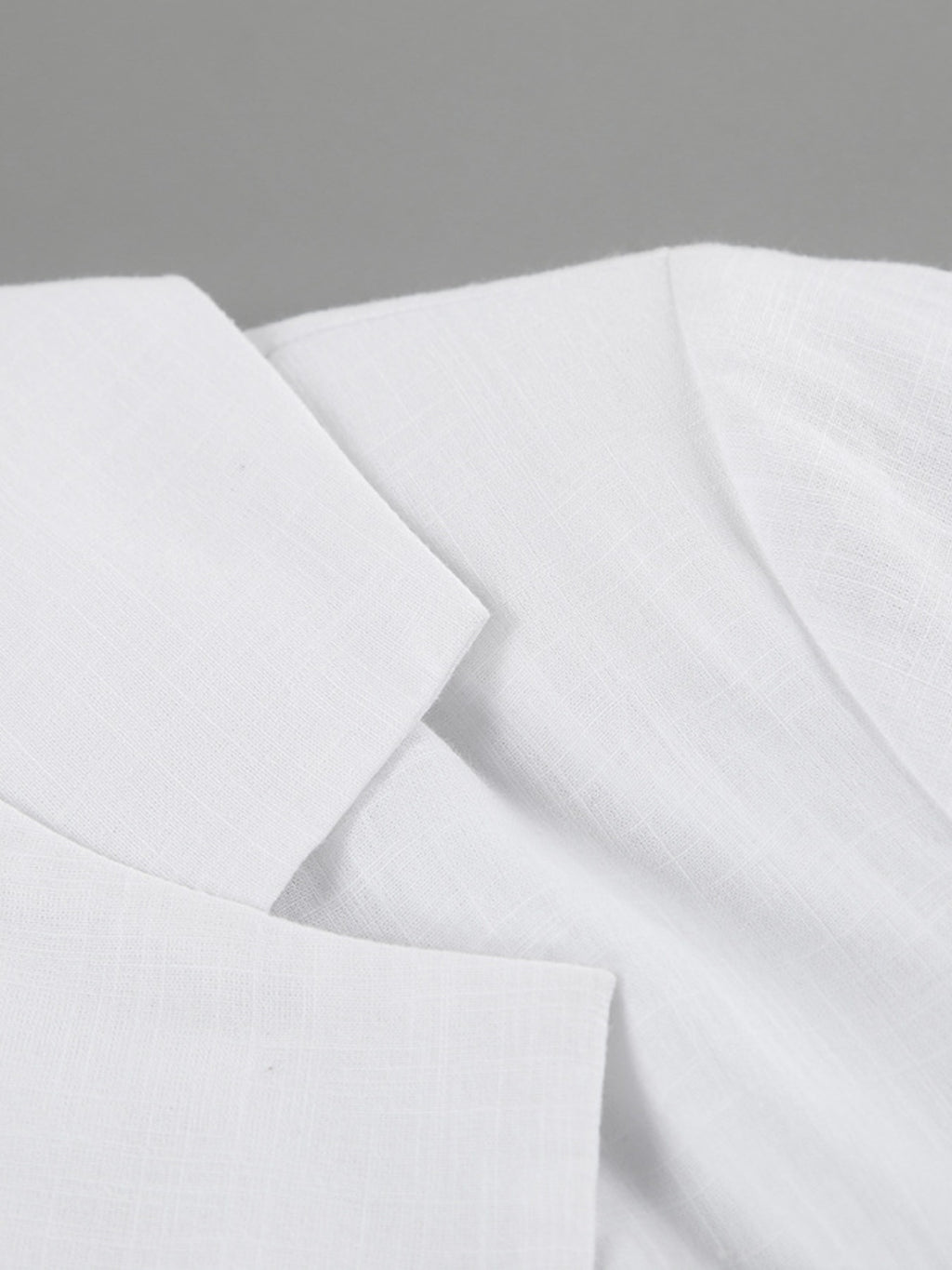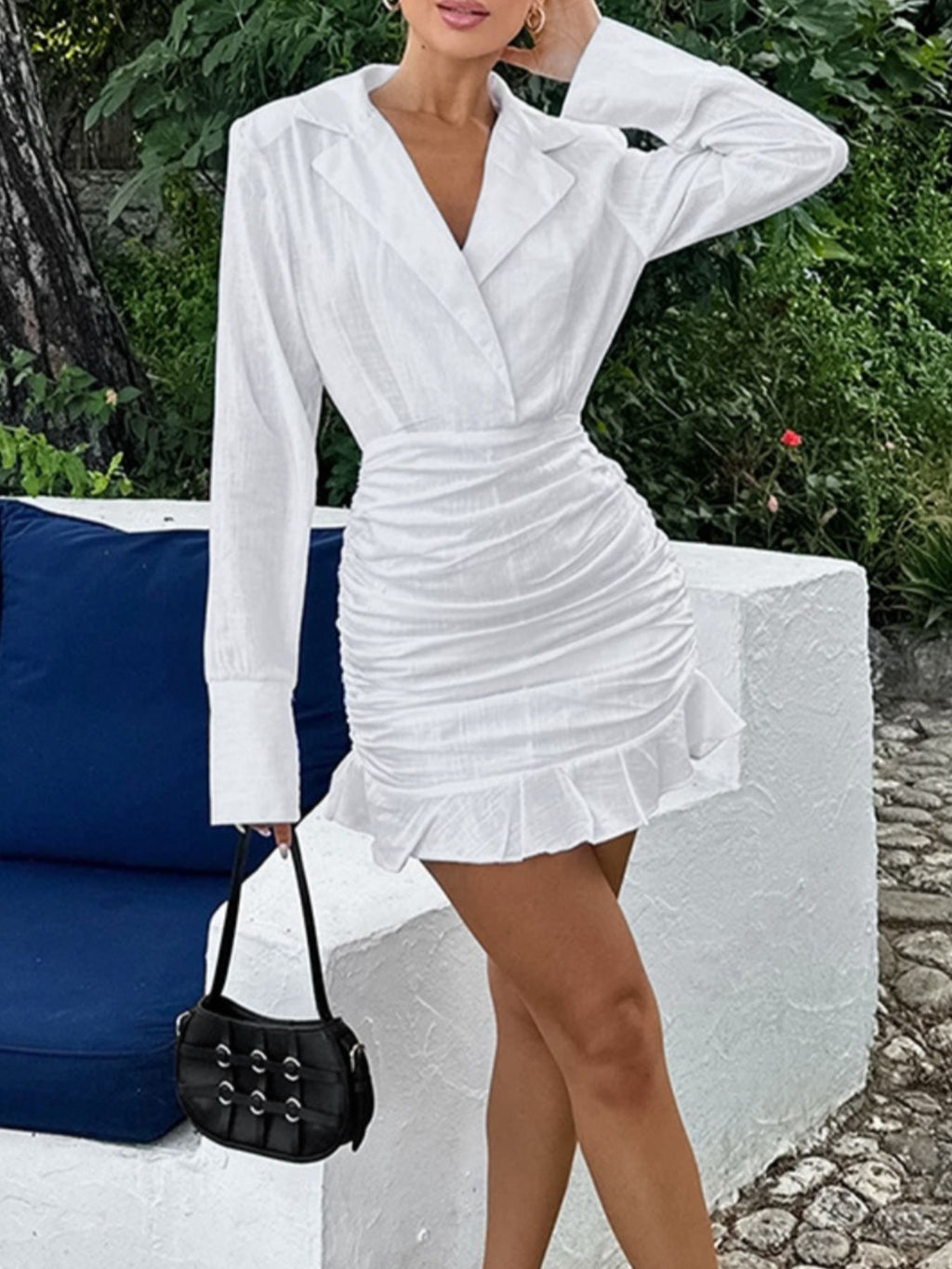 The Camille Dress borrows its attitude from classic suiting and reworks it into a curve-skimming mini. Designed with a blazer-inspired silhouette, it features a structured collar, clean lapel lines, and subtle ruching that shapes the waist without feeling tight.