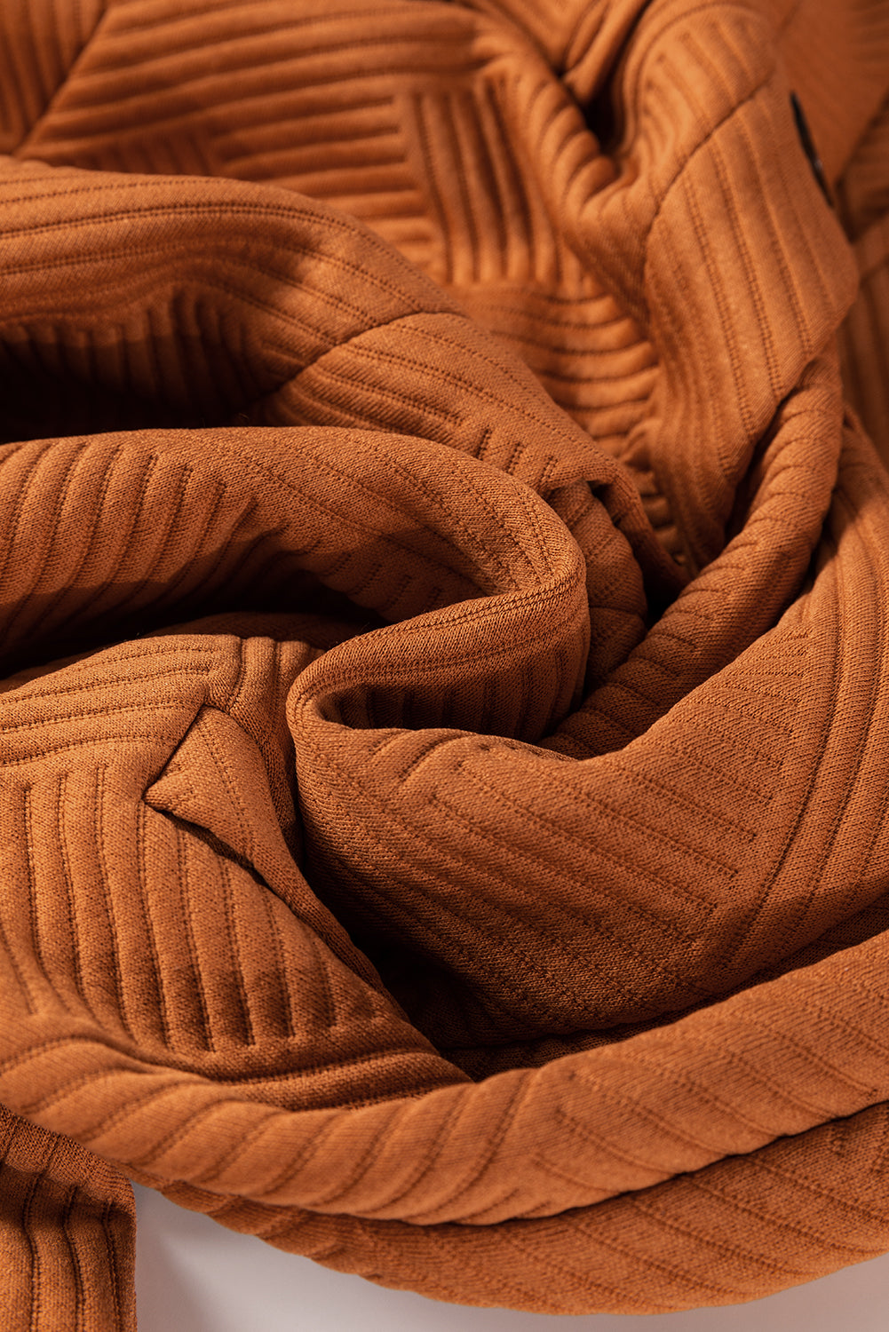 Fabric: Textured woven blend (polyester/spandex) with tactile appeal