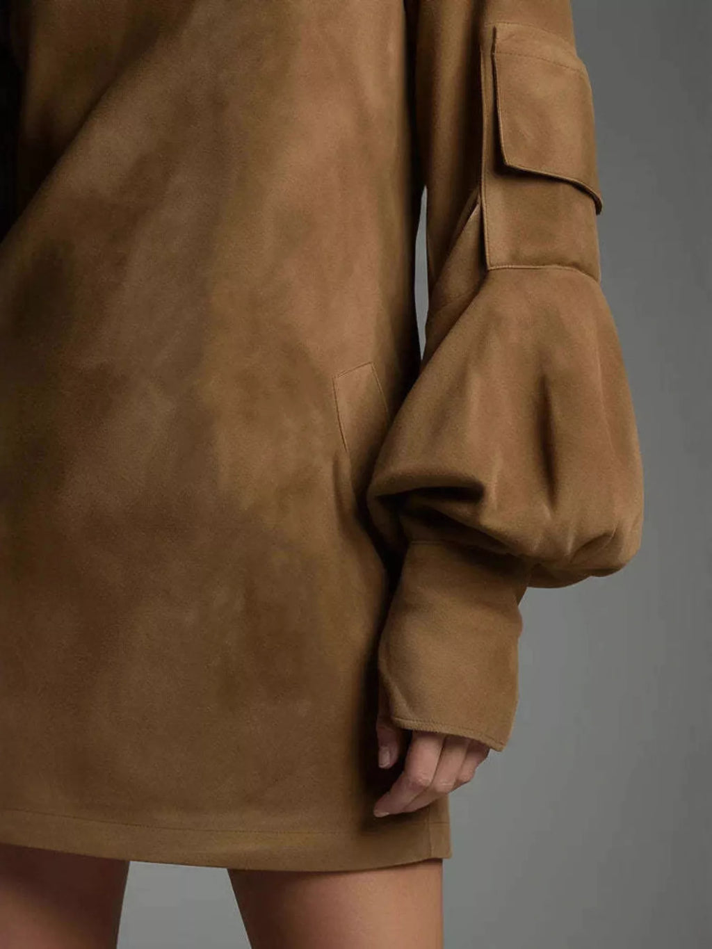 Style: Turtleneck mini dress with lantern sleeves and pockets